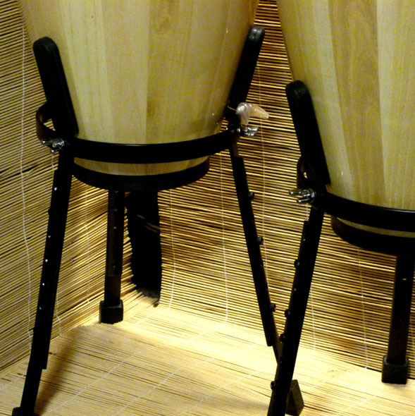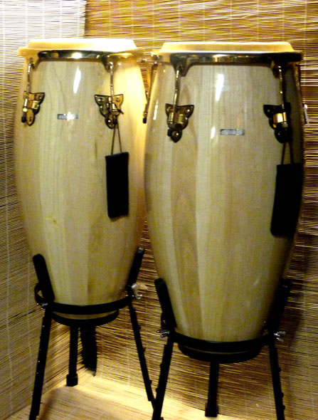 Wooding congas pair, natural wood, golden brackets, available sets: 10"+11" or 11"+11"3/4. Furnished with adjustable basket stands.