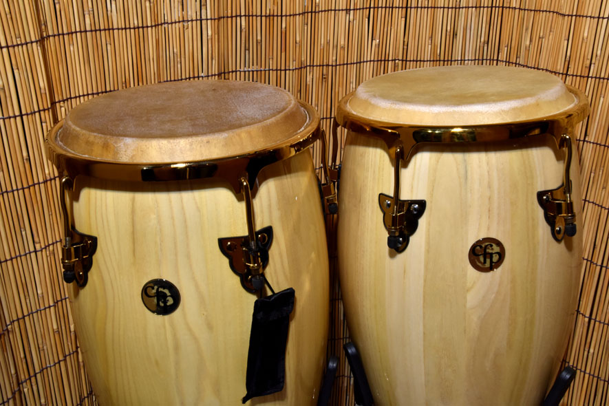 CFP two wooden conga set in natural colour with golden brackets, available in the 11"3/4+13" set. Furnished with adjustable basket sets. Powerful sound, rich in basses due to the big dimension.