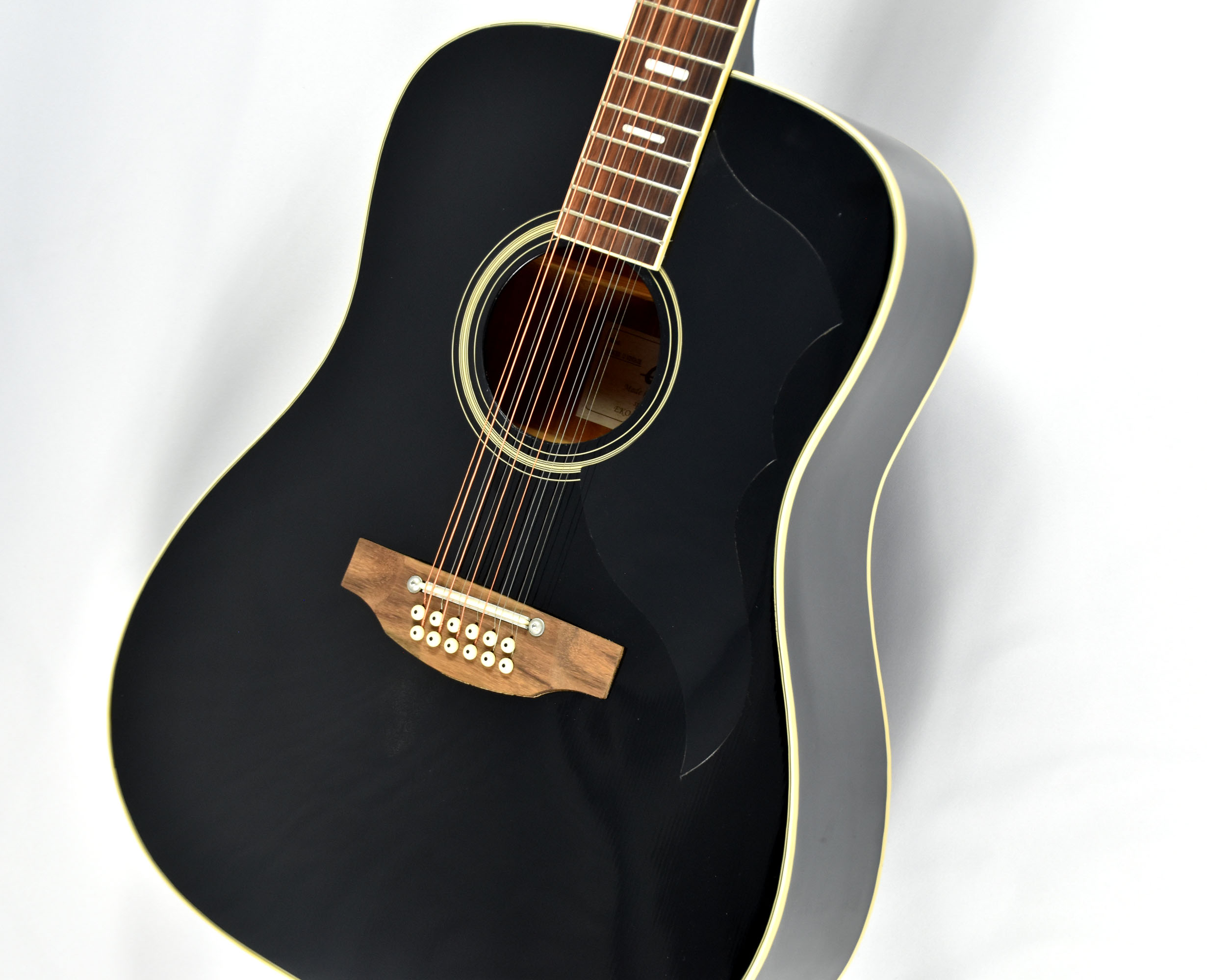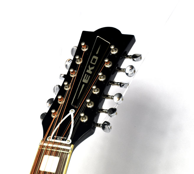 12 string acoustic guitar by Eko. Fir wood top board, basswood side and bottom boards with a black decoration, 20-frets rosewood fingerboard. Chrome uncovered tuning mechanics.