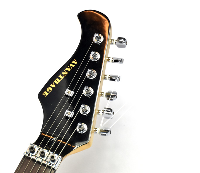 Electric left-handed guitar by Avanthage. 22-frets rosewood fingerboard. Covered self-lubricant chrome tuning mechanics, Floyd Rose-type bridge with locking nuts. Two humbucker pickups (bridge and neck) and one single coil pickup (middle), 5-way selector with tones and volumes control.